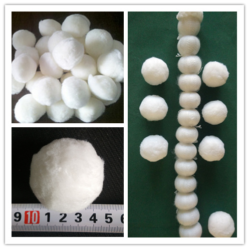 纖維球的制作——纖維球可以根據(jù)需求制作成直徑25mm--80mm不同球徑大小的纖維濾球,其材質(zhì)可采用滌綸,腈綸,丙綸等不同材質(zhì),制作工藝大同小異,把長條的長絲經(jīng)過梳理分成需要的束粗,結(jié)扎,裁剪,成型。